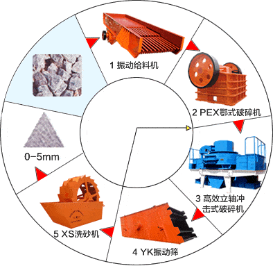 首先,石料由粗碎機進行初步破碎,然后,產(chǎn)成的粗料由膠帶輸送機輸送至細碎機進行進一步破碎,細碎后的石料進振動篩篩分出兩種石子,滿足制砂機進料粒度的石子進制砂機制砂,另一部分返料進細破。進制砂機的石子一部分制成砂,經(jīng)洗砂機(可選)清洗后制成成品砂,另一部分進制砂機再次破碎。